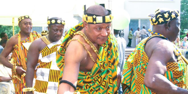 Ghanaian chiefs in Germany, adorned in authentic Kente, greet guests during the Grand Durbar in Berlin marking Ghana’s 50th Independence anniversary, June 2007. Nearly two decades later, the new GI protection gives Ghana the tools to safeguard the cultural prestige embodied in garments like these and convert it into real economic value for Kente makers. / Photo: Stephen Puni/The African Courier