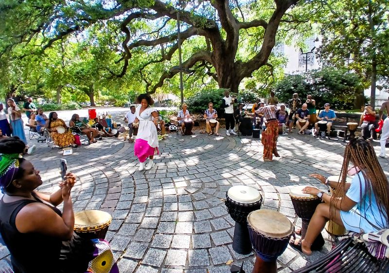If you happen to be in New Orleans on a Sunday afternoon, a visit to Congo Square — a place so vital to today’s global popular culture — is an absolute must. You will see people playing drums and horns, many dancers and others who just enjoy experiencing the living tradition, still beloved by locals, of “rocking the city with their Congo dances”.